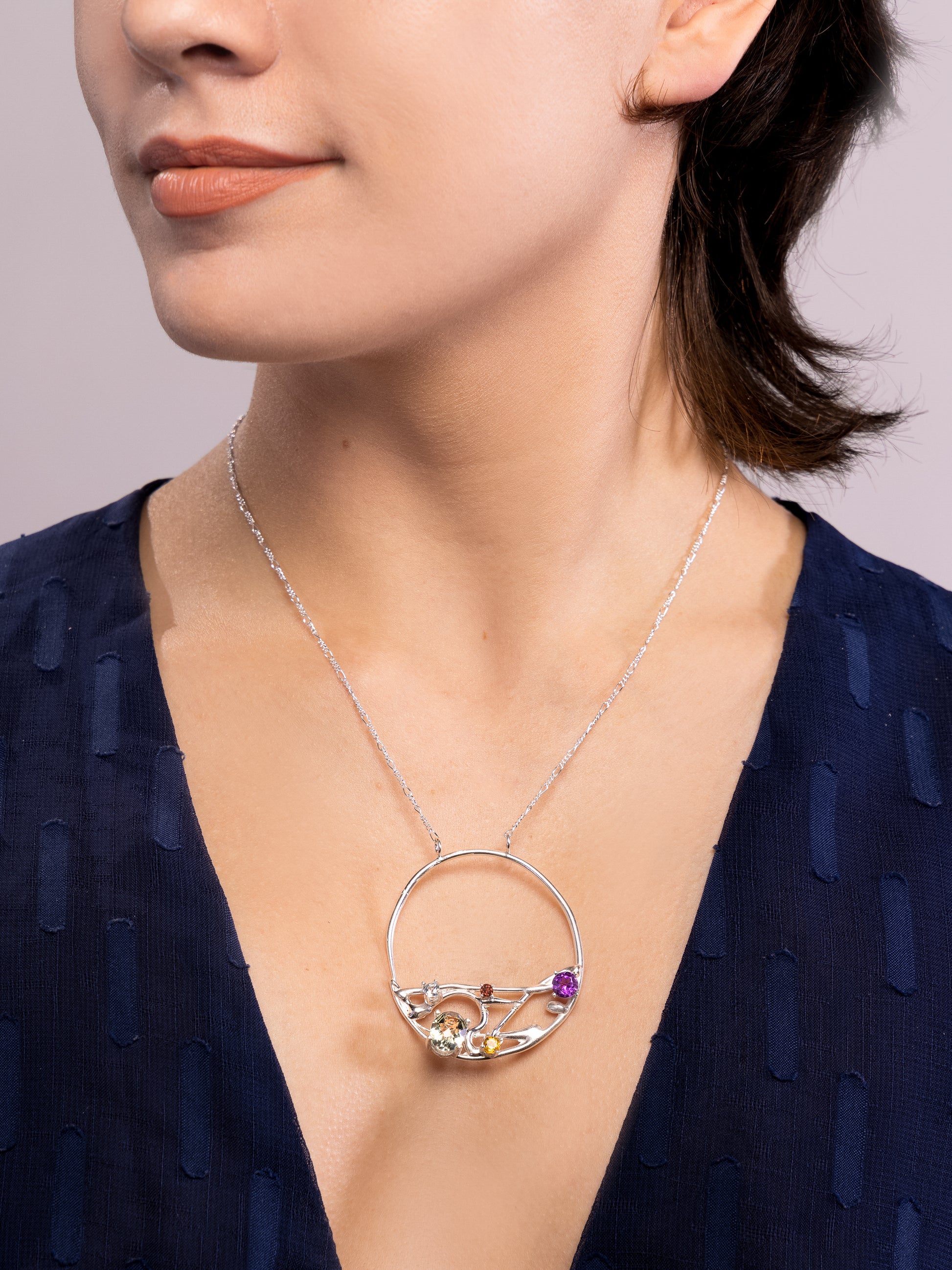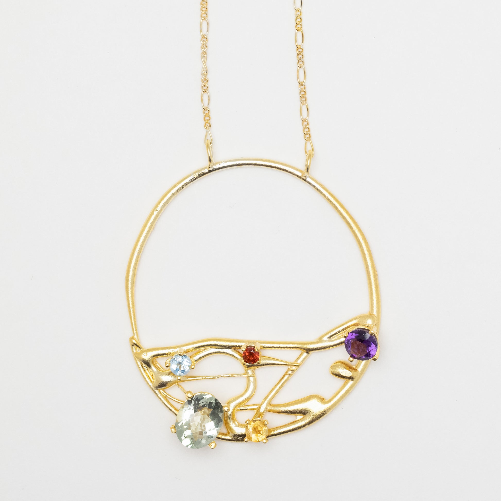 - Semi-precious stone, 3.92 total carat weight which includes Prasiolite, Amethyst, Blue Topaz, Citrine, and Garnet